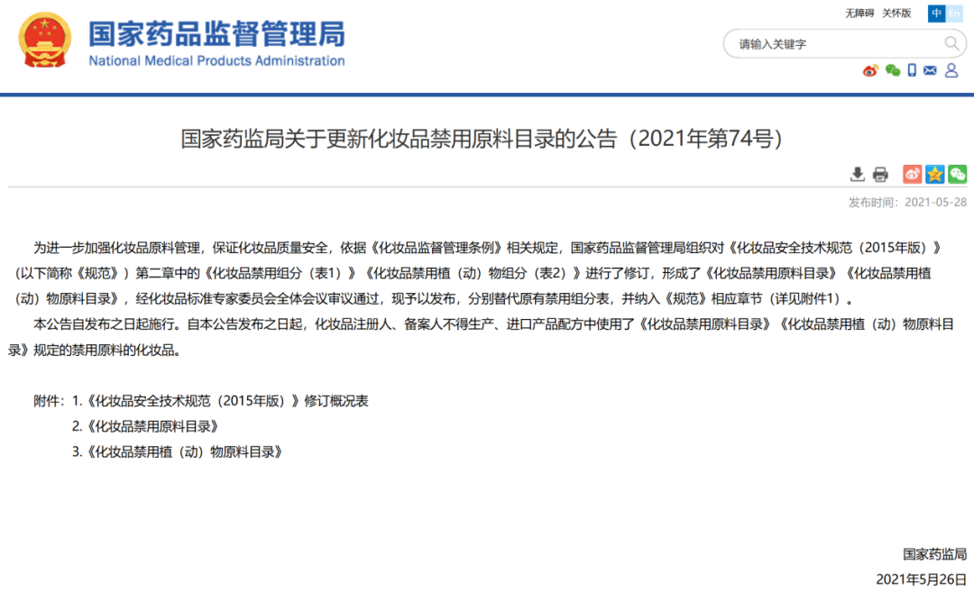 2021年,国家药监局发布《关于更新化妆品禁用原料的公告》,新增3-亚苄基樟脑、新铃兰醛、万寿菊花提取物以及此次涉及的圆叶牵牛提取物等多款原料进入禁用目录。