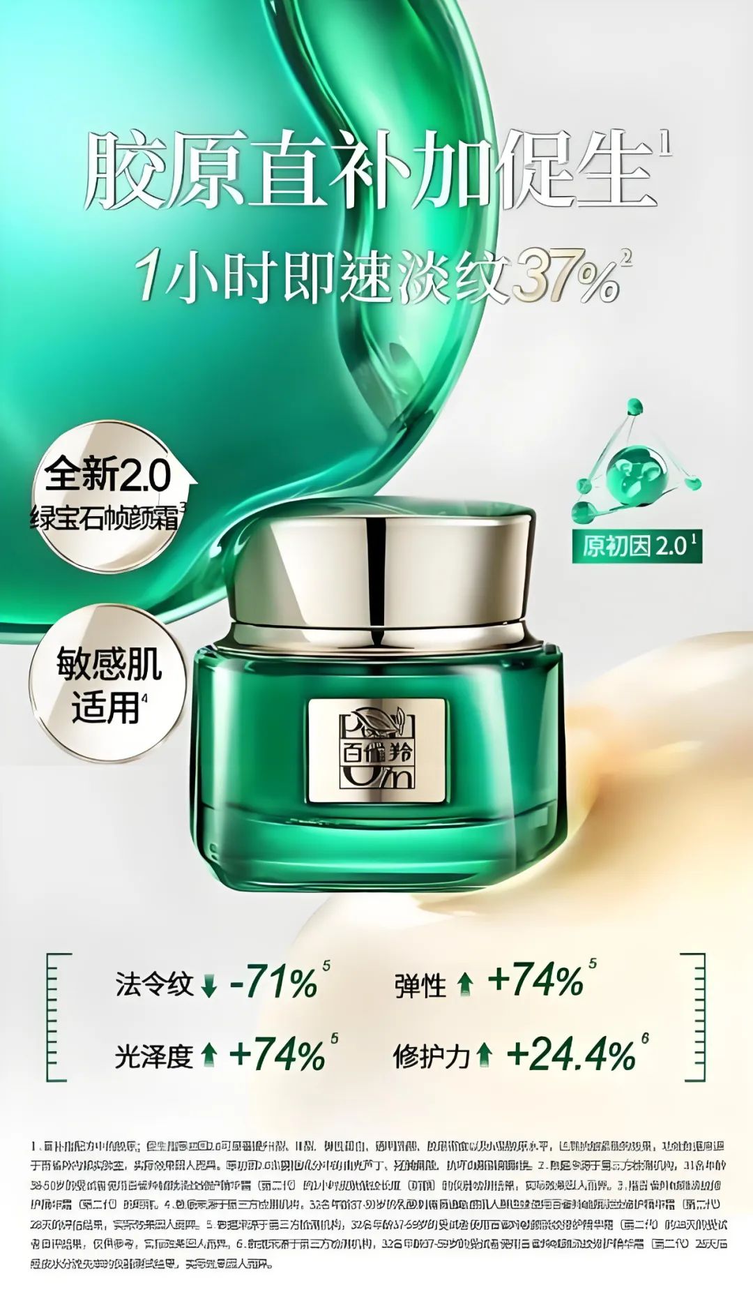 公开信息显示,原初因成分是德国默克公司独家供应给百雀羚的抗老成分。除原初因成分外,绿宝石帧颜霜还添加了重组人源化Ⅲ型胶原蛋白、相关植物提取物等成分。