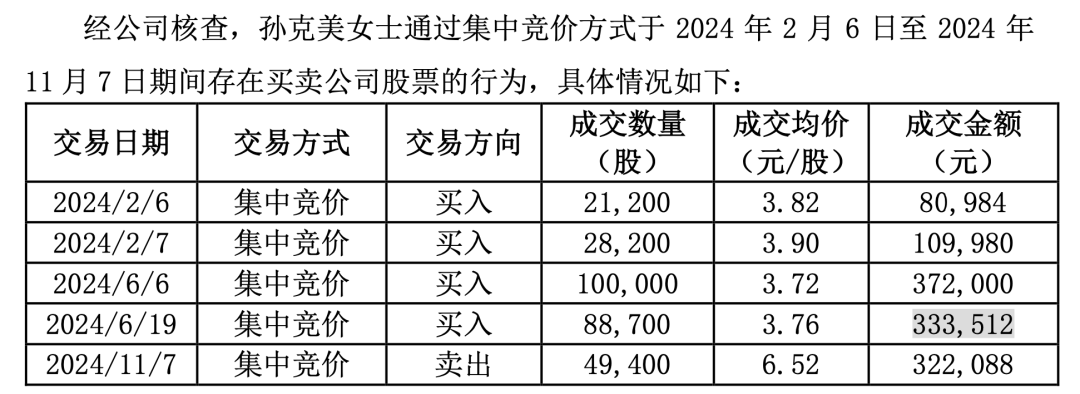 短线交易的是焦青太妻子孙克美。公告显示,今年以来,孙克美分别于2月6日、2月7日、6月6日、6月19日四次买入日出东方股票,合计买入23.81万股,共花费89.65万元,平均成交价格3.8元/股。