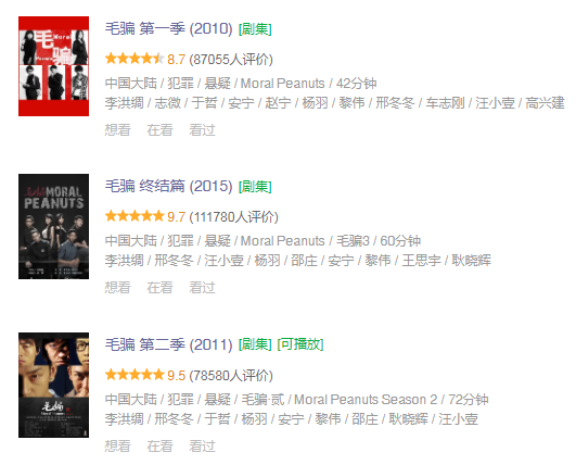 在《白夜追凶》之前,《暗黑者》《余罪》《毛骗》《心理罪》……作为“i悬疑”的毛毛,这些早期高口碑悬疑网剧她是一部都没放过,拍得最少的也得有两季。