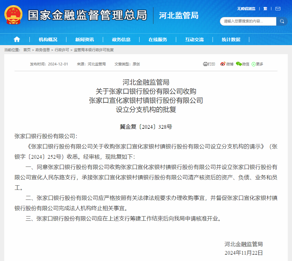 河北金融监管局同意张家口银行收购张家口万全家银村镇银行并设立张家口银行万全商业街支行、张家口银行万全宣平支行;