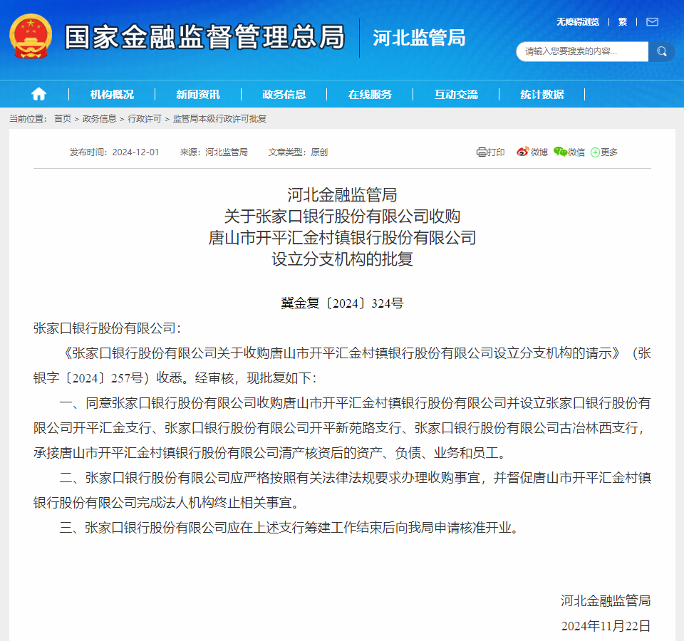 河北金融监管局同意张家口银行收购唐山市开平汇金银村镇银行并设立张家口银行开平汇金支行、张家口银行开平新苑路支行、张家口银行古冶林西支行;