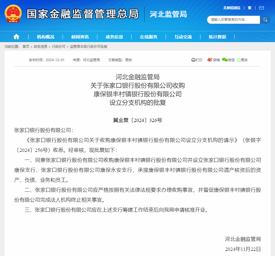 河北金融监管局同意张家口银行收购康保银丰村镇银行并设立张家口银行康保支行、张家口银行康保永安支行;