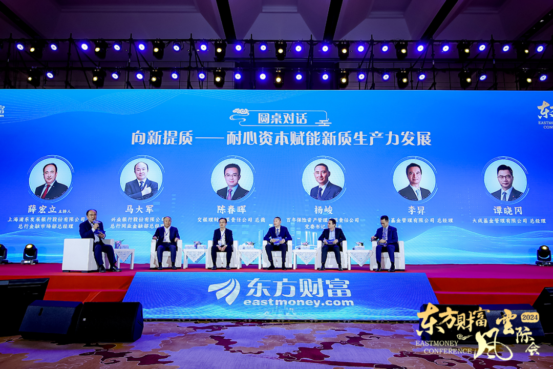 主题演讲后,在上海浦东发展银行股份有限公司总行金融市场部总经理薛宏立的主持下,兴业银行股份有限公司总行同业金融部总经理马大军,交银理财有限责任公司总裁陈春晖,百年保险资产管理有限责任公司党委书记、董事长杨峻,国泰基金管理有限公司总经理李昇,大成基金管理有限公司总经理谭晓冈,就“向新提质——耐心资本赋能新质生产力发展”为主题展开了圆桌讨论。