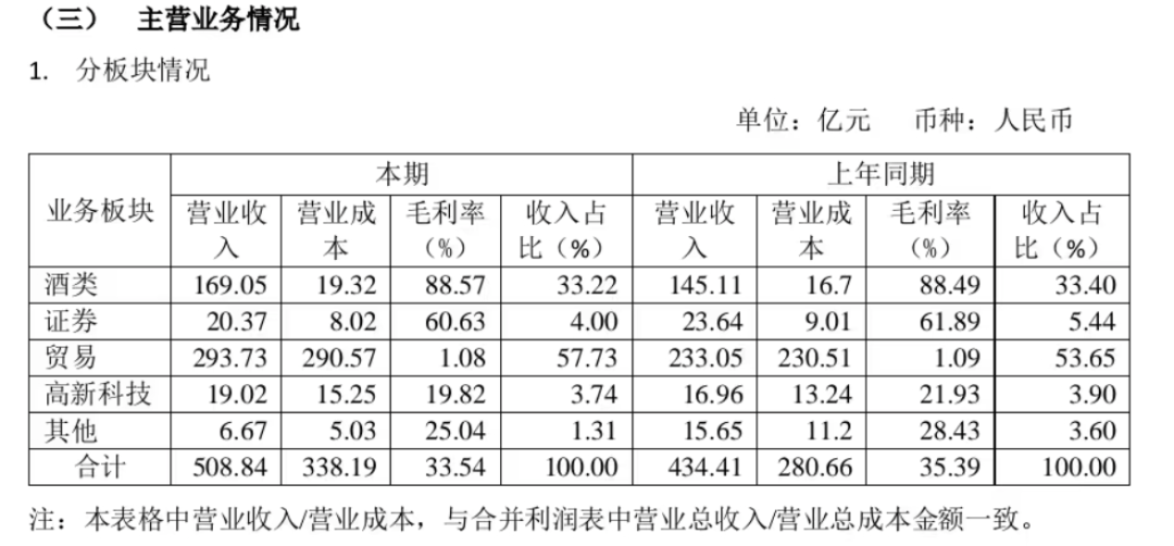 其中,证券板块是酒业之外集团毛利率最高的板块,2024年上半年,集团证券板块实现营收20.37亿元,毛利率达60.63%,仅次于白酒板块毛利率88.57%。
