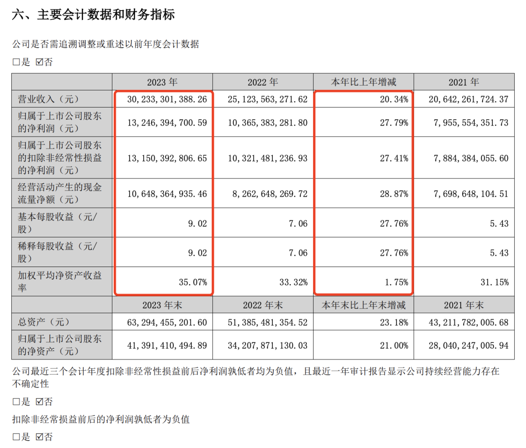 客观来说,2023年泸州老窖的财报数据还是不错。报告期内,实现营收302.33亿元,同比增长20.34%,净利润132.46亿元,同比增长27.79%。虽然营收仍然落后于洋河和汾酒,但已是泸州老窖首次突破300亿大关,超过20%的增速在白酒上市公司里也算稳健。