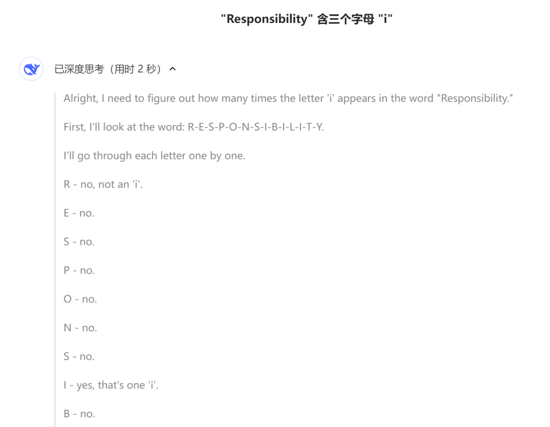 比如,把“Responsibility中有几个字母i?”的问题抛给Deepseek R1,在深度思考模式中,我们能够看到大模型的思考过程:它先把单次拆解成一个个字母,再逐步比较每个字母是什么,最终给出了正确的结果。在测试中,R1的思考速度也够快,用不到两秒的时间给出了答案。