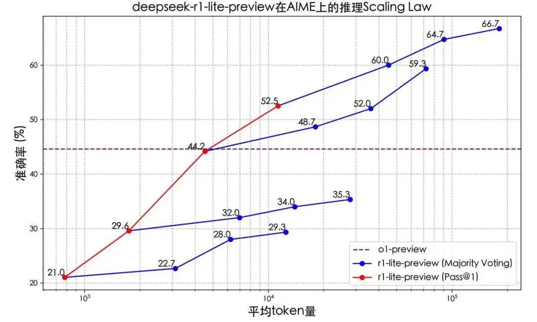 在Deepseek公布的测试效果中,可以看到,DeepSeek-R1-Lite的推理时间和准确率成正比关系,即推理时长越长,跑出的效果就越好。和过往没有“慢思考”能力的模型相比,R1的表现远优于前者。