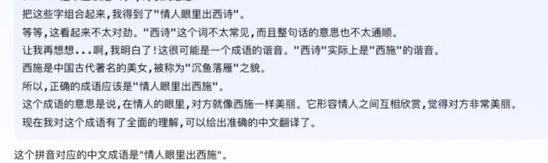 发布自研模型时,昆仑万维给了大模型一个“陷阱”题目。让它回答存在中文读音“陷阱”的问题——“请将qíng rén yǎn lǐ chū xī shī转换为中文”。在第一次思考得出结论时,大模型主动发现了“西诗”是不对的说法,通过推理找到了准确的翻译结果。