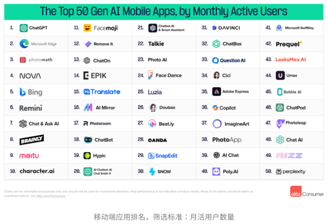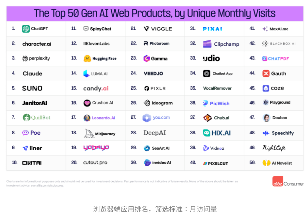 险投资机构a16z每隔半年会追踪SimilarWeb和SensorTower对应 的 户流量统计,并按照浏览器端和移动端两个平台,分别按照 访问量、 活 户数量进 排名,截 2024年6 ,浏览器端和移动端按照 户流量排名前50的应 如下: