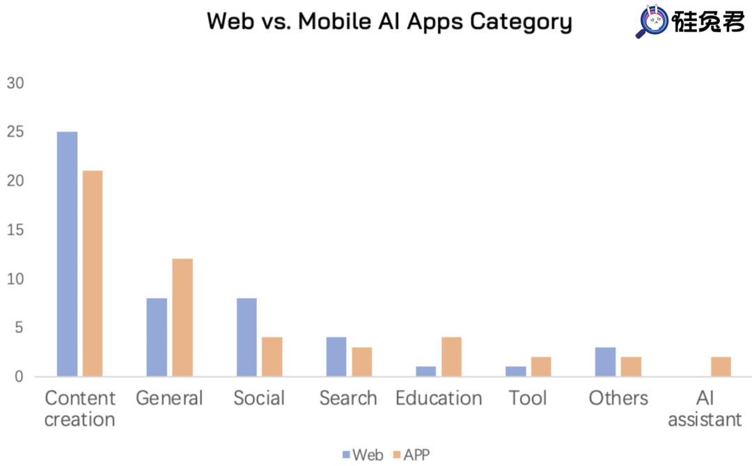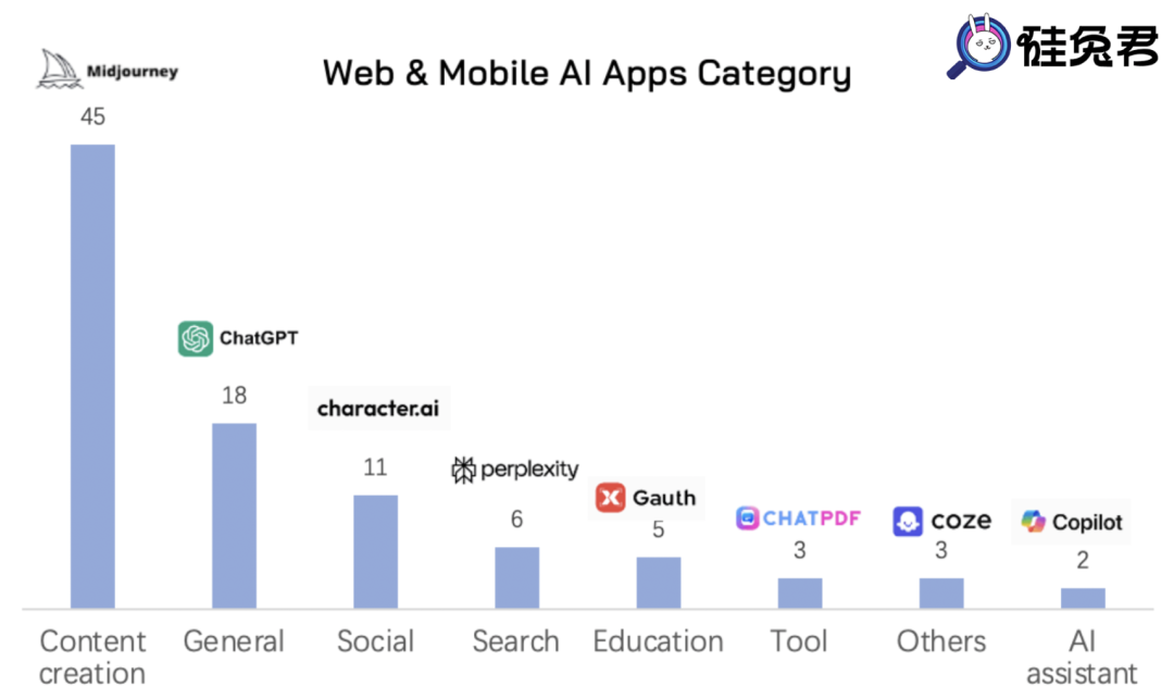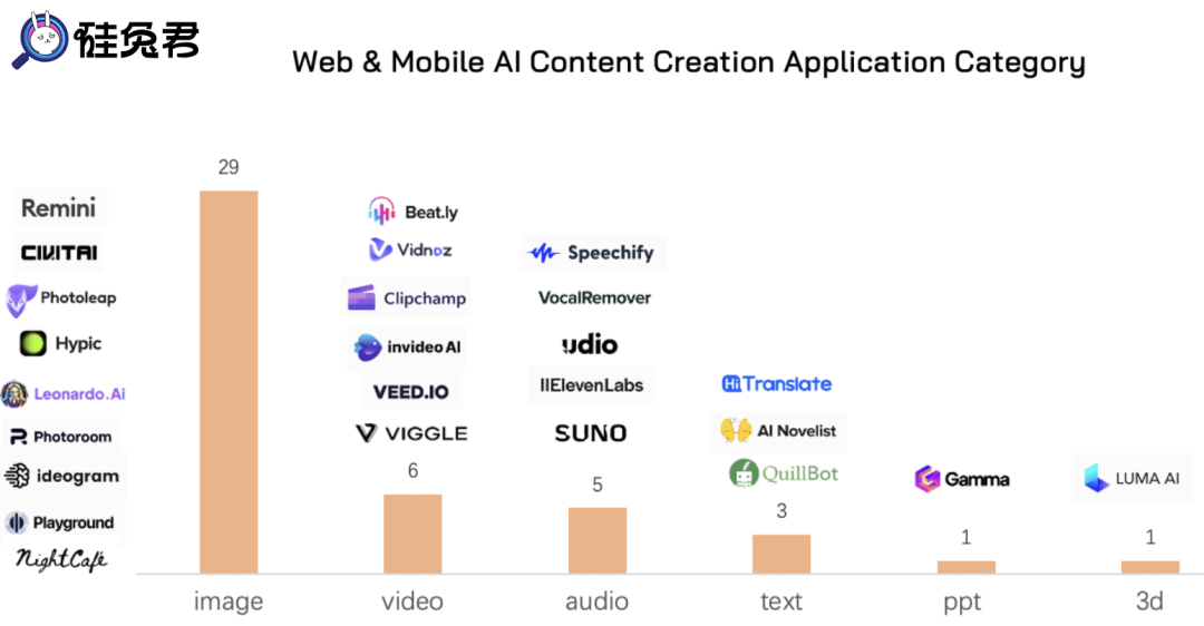 第一,移动端加上浏览器端共有45款AI内容生成应用,包括图片、视频、音频、文字、PPT、3D几种不同的模态内容生成,占据48.4%。