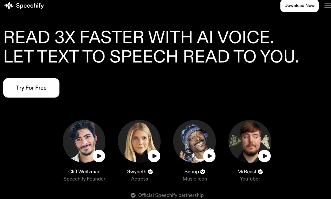 用户可以通过Speechify的AI功能将书面文本转换为口语,听文章、书籍、文档甚至网站,消除了阅读困难所带来的障碍。
