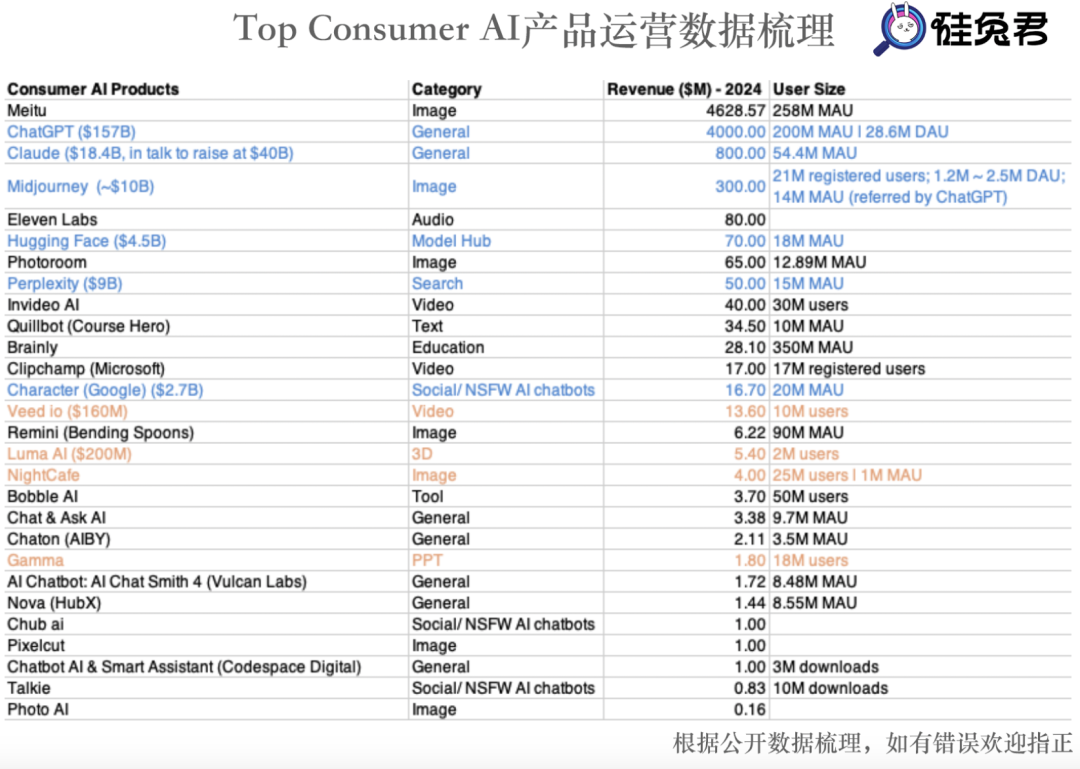 硅谷早期风险投资机构UpHonest Capital行研团队针对这一现象进行了深度调查和分析,试图提前找到下北美消费级AI应用的最新趋势。我们根据以上应 列表,从应 领域、资本情况、 户数量、收 规模四个维度进 了数据统计,希望从中发现 些关于消费级AI应 现状的规律。