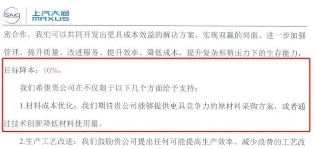 今年11月28日,上汽大通向供应商致信,表示邀请供应商伙伴共同参与到成本控制项目中,并提出降本10%的目标,再次成为市场焦点。