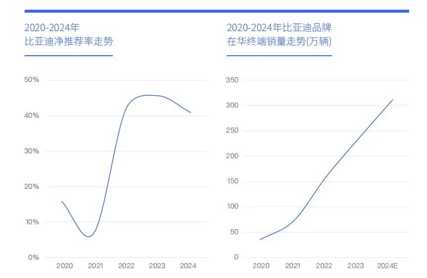 进入2024年,比亚迪将2023年初推出的冠军版车型升级为荣耀版,进一步加剧了价格战。老车主受到价格波动影响,降低了品牌推荐的积极性,导致比亚迪的用户净推荐率由2023年的45.61%降至2024年初的40.88%。尽管如此,比亚迪的整体净推荐率仍在40%以上的高位。