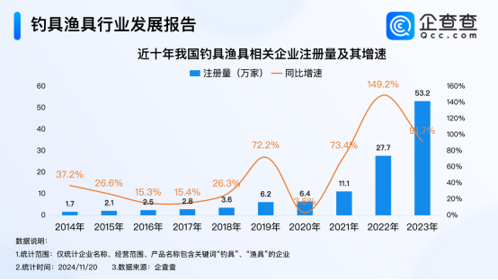 企查查数据显示,近十年,我国钓具渔具相关企业注册量逐年增加,尤其是2021年开始,注册量进入快速攀升阶段。2021年我国钓具渔具相关企业注册量首次突破10万家,全年注册量同比增加73.4%至11.1万家,次年相关企业注册量同比大幅增加149.2%至27.7万家,达近十年注册量增速峰值,2023年我国钓具渔具相关企业注册量首次突破50万家,全年注册量同比增加91.7%至53.2万家,创近十年注册量新高。