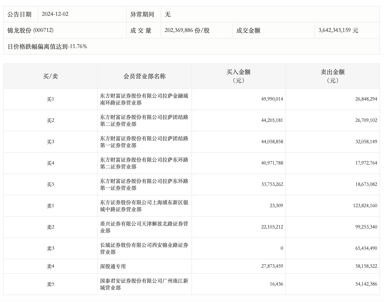 12月2日,锦龙股份今日跌停,龙虎榜数据显示,上榜营业部席位全天成交7.86亿元,占当日总成交金额比例为21.58%。其中,买入金额为2.63亿元,卖出金额为5.23亿元,合计净卖出2.6亿元。