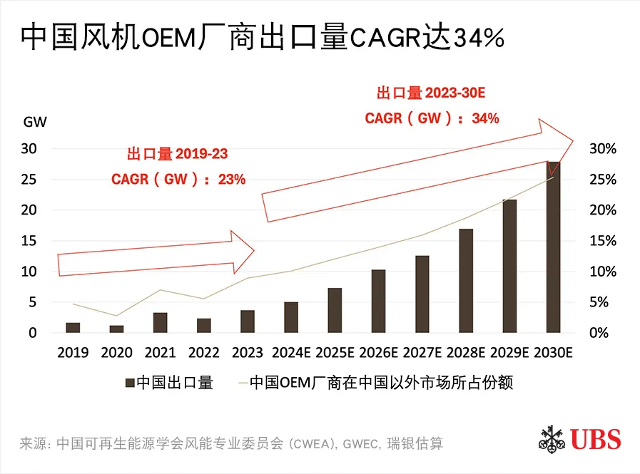 基于中国企业优势,瑞银统计称,预计到2030年,中国厂商将在亚太、中东和非洲及拉美地区占据主导地位,到2030年其市场份额有望从现在的不足30%升至60%以上。