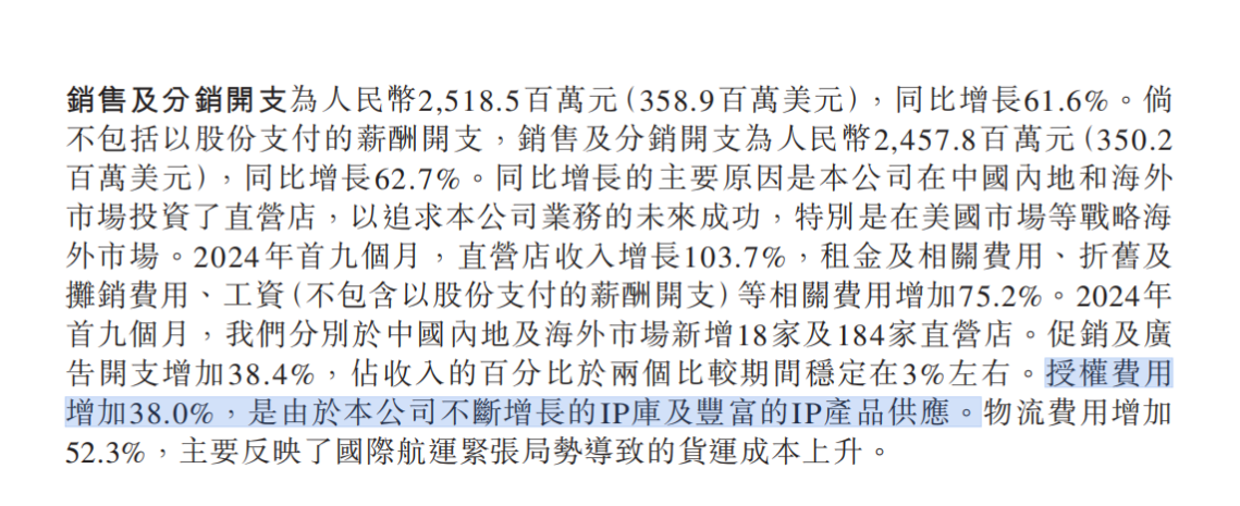 名创优品为了这些“全球IP”耗资巨大。结合半年报数据,2024年上半年,名创优品的授权费支出已经达到了惊人的1.82亿元。最新的Q3财报数据进一步显示,前九个月,集团的授权费成本同比增长了38%。