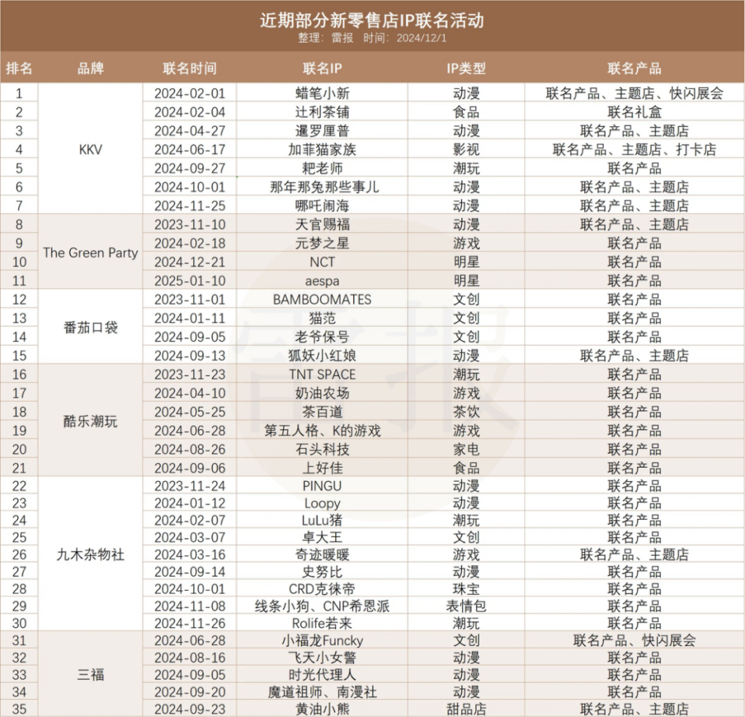 除了自有IP声量不足之外,依赖IP合作的名创优品也要面临更多同业者的竞争。近年来,以KKV、The Green Party、九木杂物社为代表的其他综合潮流零售店正在崛起,并且同样在IP联名产品上下足了功夫,部分零售店今年的IP联名活动接近十起,见下表(仅统计零售店品牌独立合作的IP联名,不含频率更高的IP产品首发/上新等相关活动):