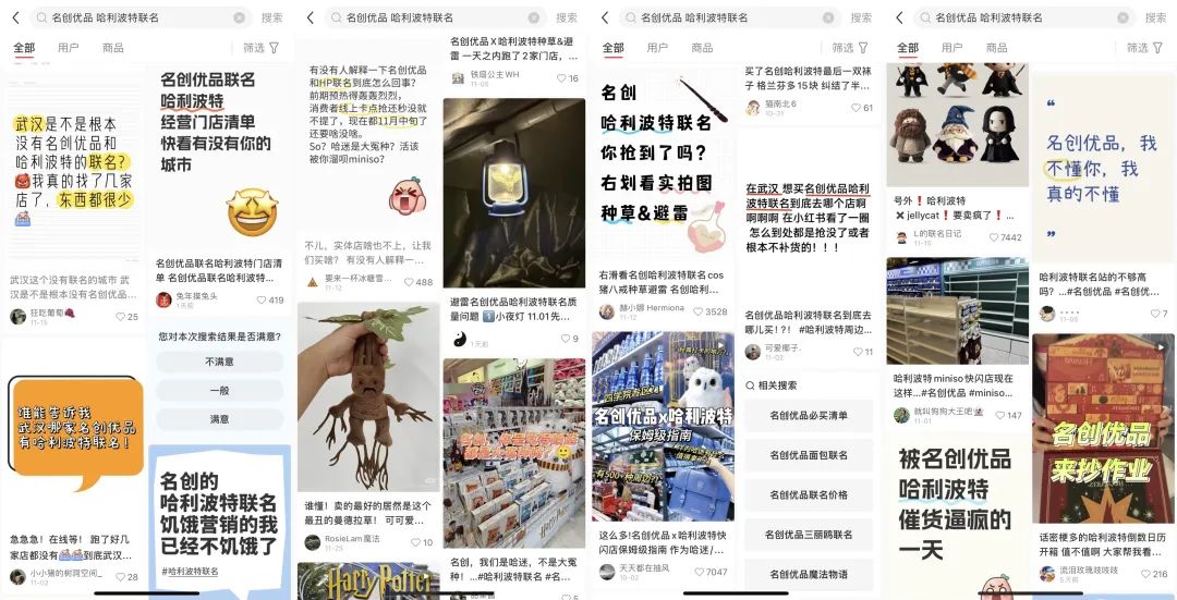 就拿最近名创优品与哈利波特IP的联名举例,尽管活动前期预热声势浩大,但许多消费者在互联网上反馈,除了线上店铺卡点抢购抢不到,线下门店的联名产品也供货不足、很难买到,微博、小红书等平台上,关于名创优品此次IP联名活动的“避雷帖”在持续发酵。