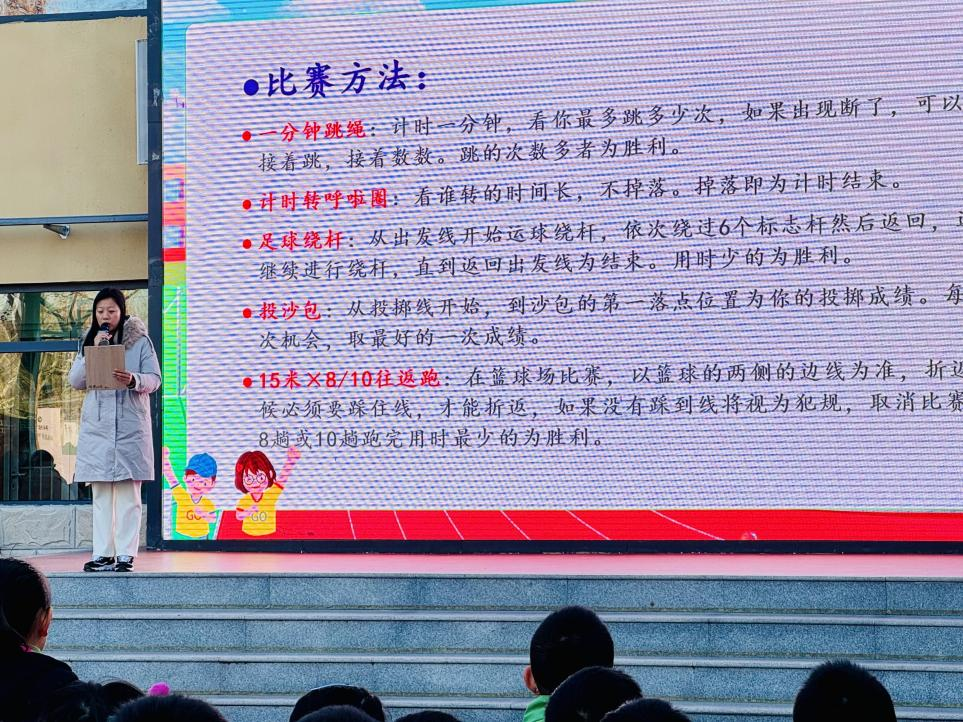 随后,体育组王江红老师宣布2024年冬季运动月启动。王老师详细介绍了此次活动的五大类比赛项目,并希望全体同学认真上好体育课,掌握体育锻炼技能与方法,自觉养成体育锻炼的好习惯。