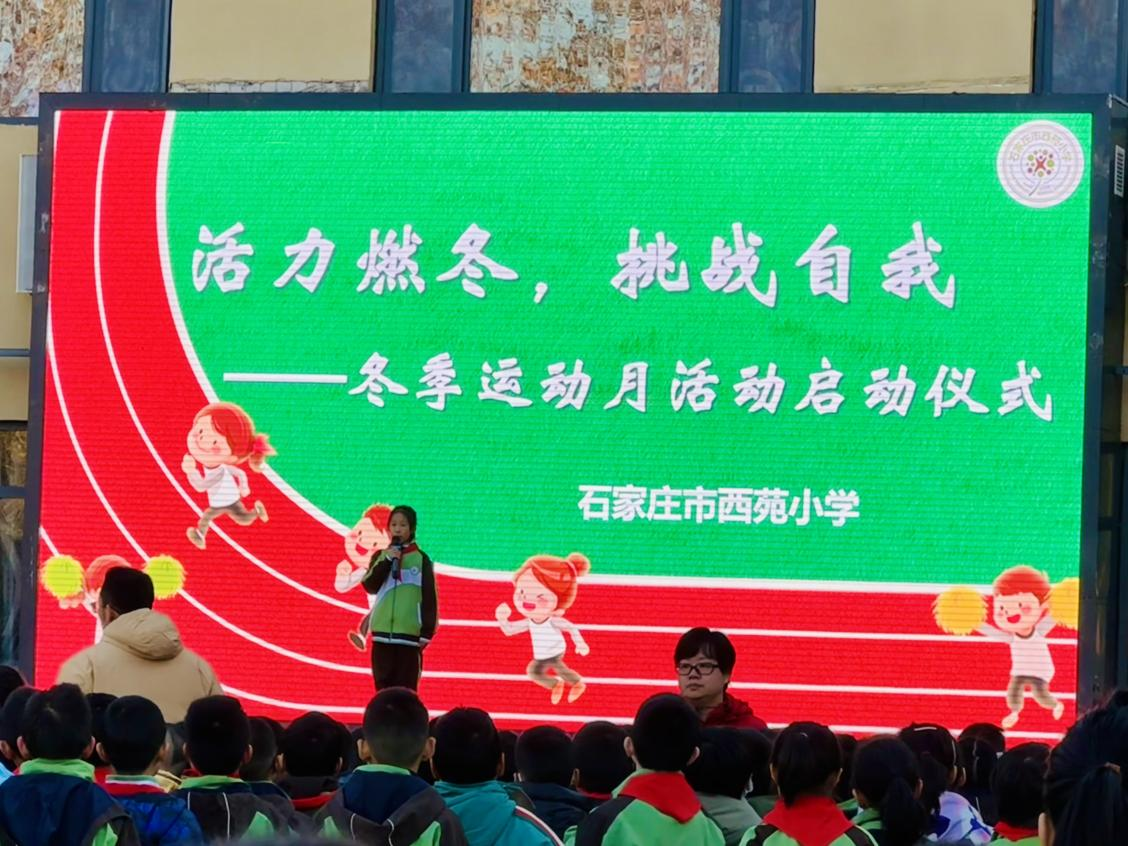 少年不畏严冬至,飞扬活力正当时!为活跃校园文化生活,有效开展阳光体育运动,提高全体同学的身体素质和健康水平,12月2日上午,石家庄市西苑小学举行“活力燃冬,挑战自我”——冬季运动月活动启动仪式。本次仪式由四(7)中队主持。