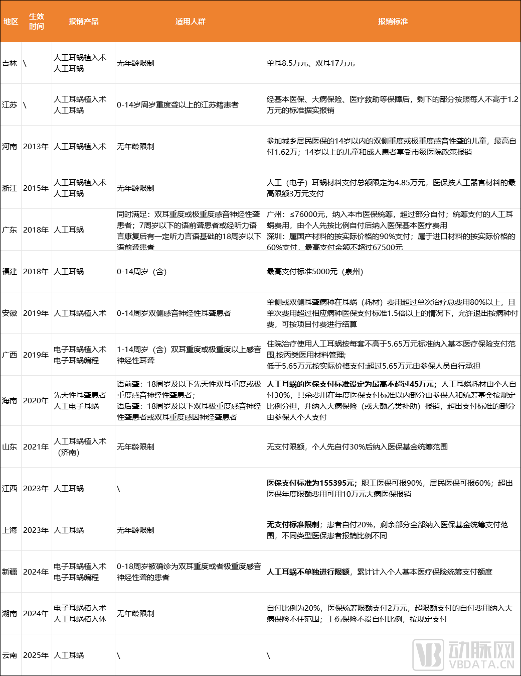 在医保政策上,虽然基本医疗保险制度尚未将人工耳蜗在全国范围内纳入医保支付范围,但全国十多个省市已将人工耳蜗纳入医保甲类、乙类进行管理,减少患者医疗负担,其中海南最高支付标准可到45万元、上海无支付标准限额等。