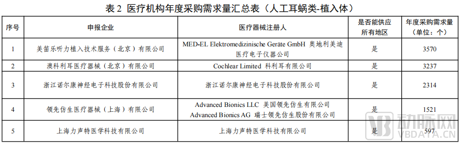 根据2号文件内容,人工耳蜗类医用耗材品种中,植入体年度采购需求量为11239个。支持3.0T磁共振的最高有效报价60000元/个,最高总采购额约6.74亿元。言语处理器年度采购需求量为10943个。按照一体式言语处理器15000元/个(其中,调剂费用300元/次,售后服务费用300元/次)的最高有效申报价,最高总采购额约1.64亿元。