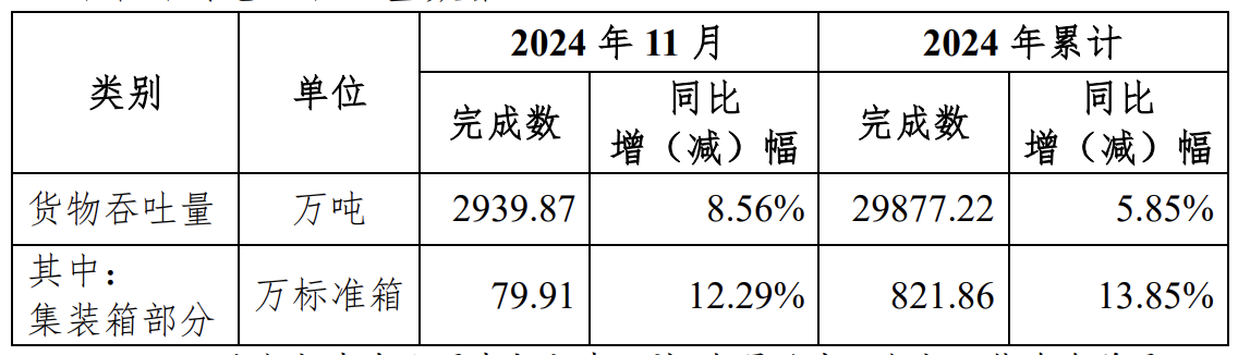 北部湾港12月3日公告,2024年11月货物吞吐量为2939.87万吨,同比增长8.56%;2024年累计货物吞吐量为2.99亿吨,同比增长5.85%。集装箱部分,11月完成79.91万标准箱,同比增长12.29%;2024年累计完成821.86万标准箱,同比增长13.85%。