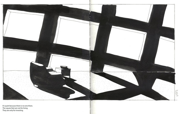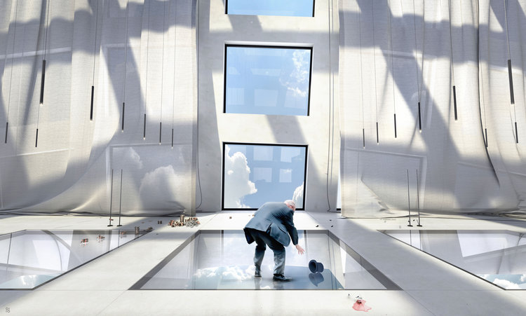 再回到这座U型大楼,oiio的目标是让它成为光芒盖过中央公园的地标建筑,这大概是所有建筑师的梦想——自己的作品将使曼哈顿天际线多出一道弧线。从实用性来看呢?这张图告诉你,The Big Bend根本不是用来住人的,多少有些讽刺,甚至影射了纽约林立的高楼,宽大的窗帘遮住了阳光,大楼里充满了铜臭味。