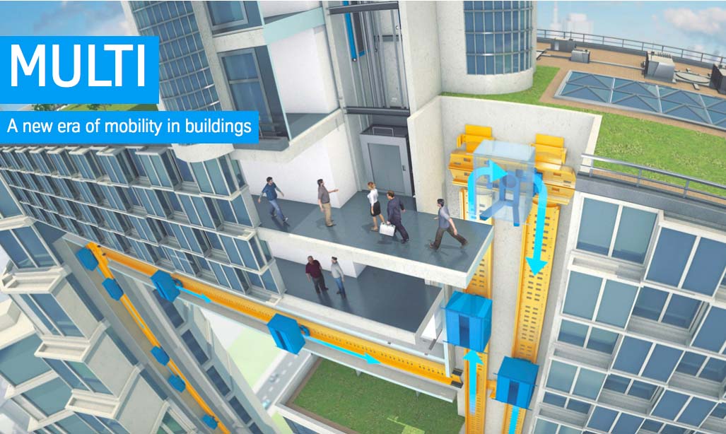 首先面临的问题是,顶部弯道部分电梯如何解决?如果使用内部电梯,如何转弯?在电梯制造商蒂森克虏伯揭开MULTI全功能电梯试验模型的神秘面纱之前,oiio才不敢画出如此惊人的图纸,MULTI实现的是水平移动,利用线性马达技术代替传统的缆绳,将传统电梯运输模式转变为类似地铁系统的运作方式,电梯井道向轿厢传递感应电能,能够让多个轿厢能够在一个井道内保持一定距离安全上行,在另一个井道内安全下行,形成一个连续的环路,正因为MULTI打破了缆绳电梯长达160年的统治,能够将井道的运输能力提升50%,所以oiio准备采用这一技术解决顶部弯道的电梯难题,让电梯自己“学会转弯”,做一台灵活的电梯吧。