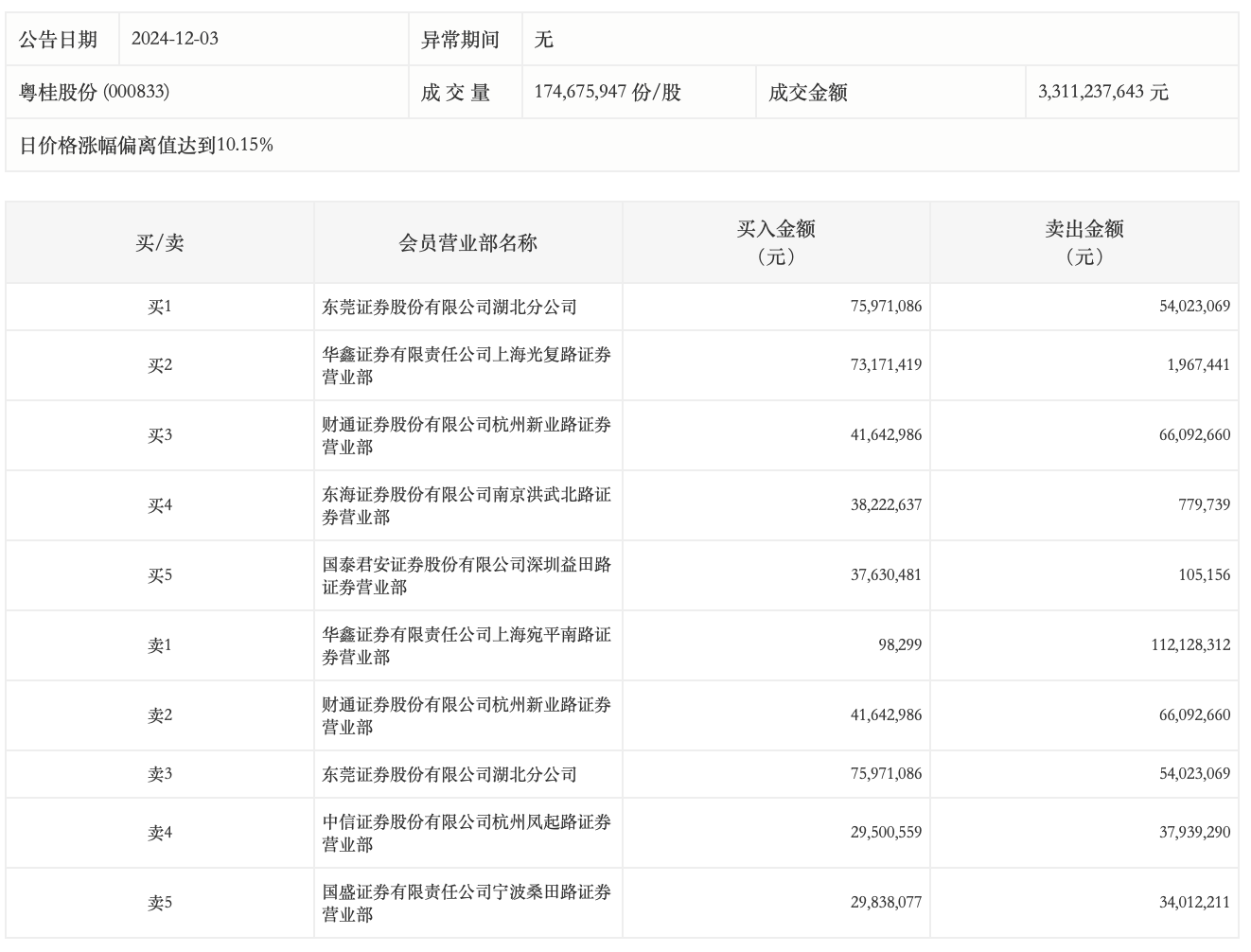 12月3日,粤桂股份今日涨停,龙虎榜数据显示,上榜营业部席位全天成交6.33亿元,占当日总成交金额比例为19.12%。其中,买入金额为3.26亿元,卖出金额为3.07亿元,合计净买入1902.77万元。