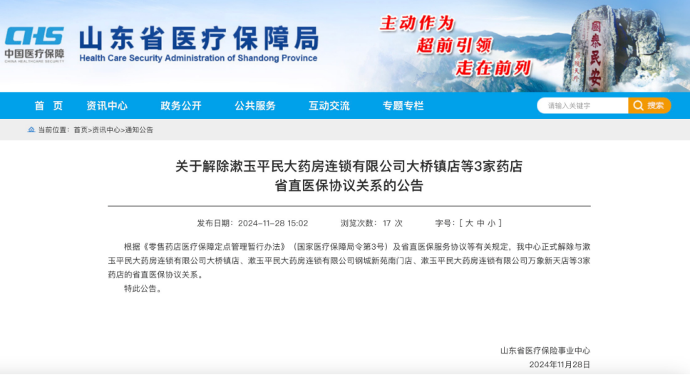 山东省医疗保障局11月28日公告称,解除漱玉平民大桥镇店、钢城新苑南门店、万象新天店3家药店的省直医保协议关系。漱玉平民万象新天店及钢城新苑南门店存在将非医保药品或其他商品串换成医保药品并使用职工基本医疗保险个人账户结算的违约行为,大桥镇店存在重大信息变更但未办理变更手续的违约行为。