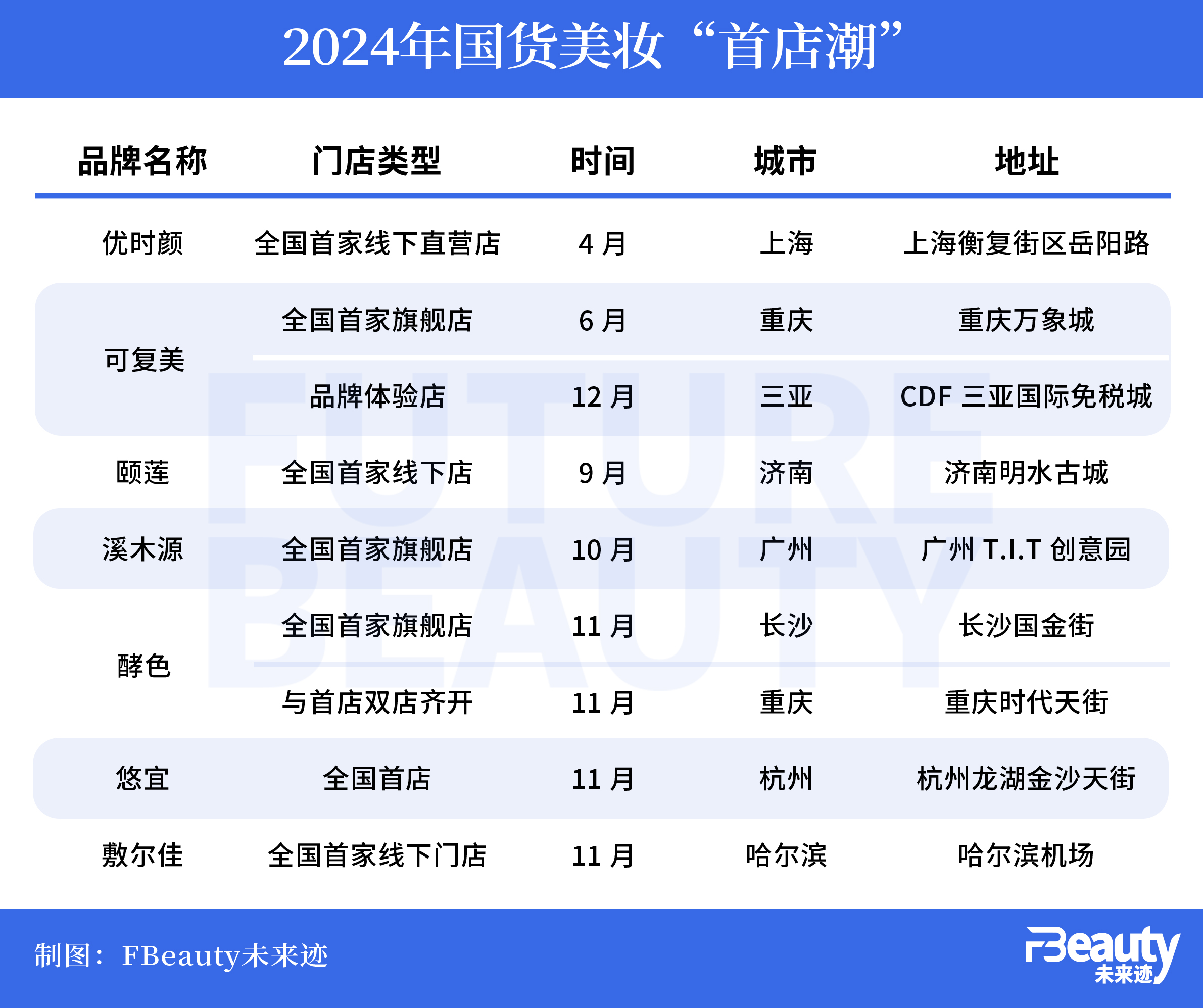 2024年,溪木源、酵色、悠宜、敷尔佳、优时颜、颐莲、可复美等国货美妆,共同掀起了一场“线下首店潮”。