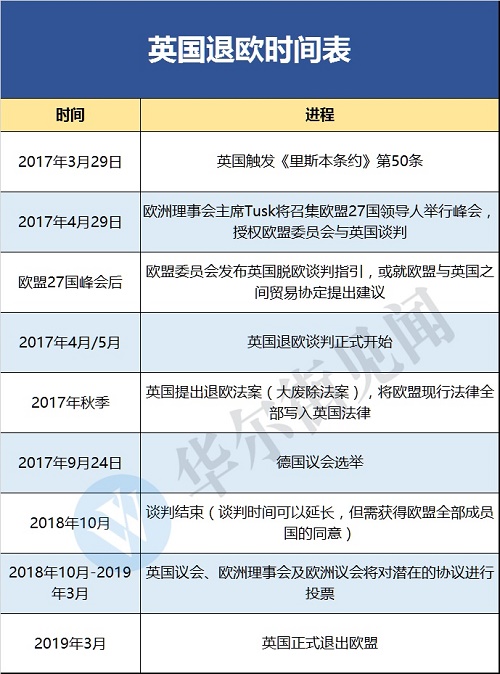 根据规则,无论谈判结果如何,英国都将在两年后退欧,除非在全体欧盟成员国同意的情况下才可延长。英国退欧期间的重要时间节点如下图:
