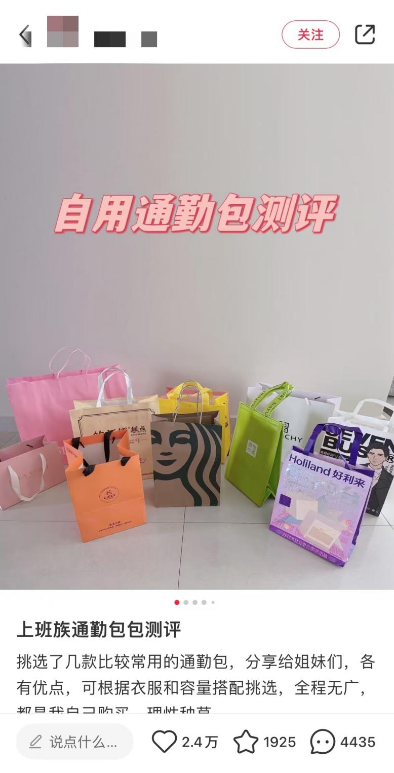 “上班通勤包包测评”“最适合上班人的包包出现了”“通勤包坏了,忍痛配货2杯购置”,这些帖子里热议的包包并非那些难以入手的大牌包,而是外卖奶茶保温袋或者其他餐饮品牌的打包袋,其中呼声最高的是奈雪的保温袋。唐心开玩笑说:“看到路边联名款的奶茶袋,我可能真的忍不住会捡。”
