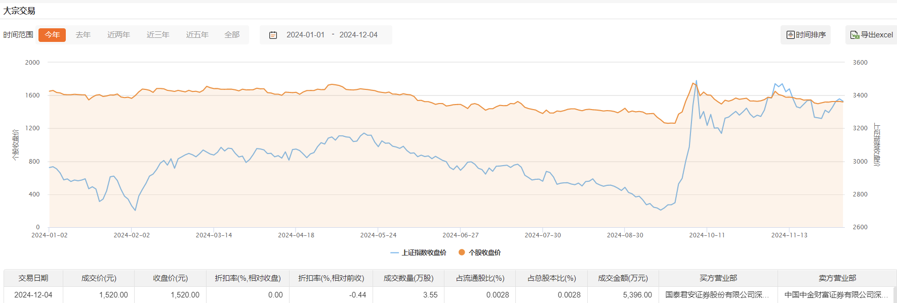 12月4日,贵州茅台今日大宗交易成交3.55万股,成交额5396万元,占当日总成交额的1.47%,成交价1520元,较市场收盘价持平。