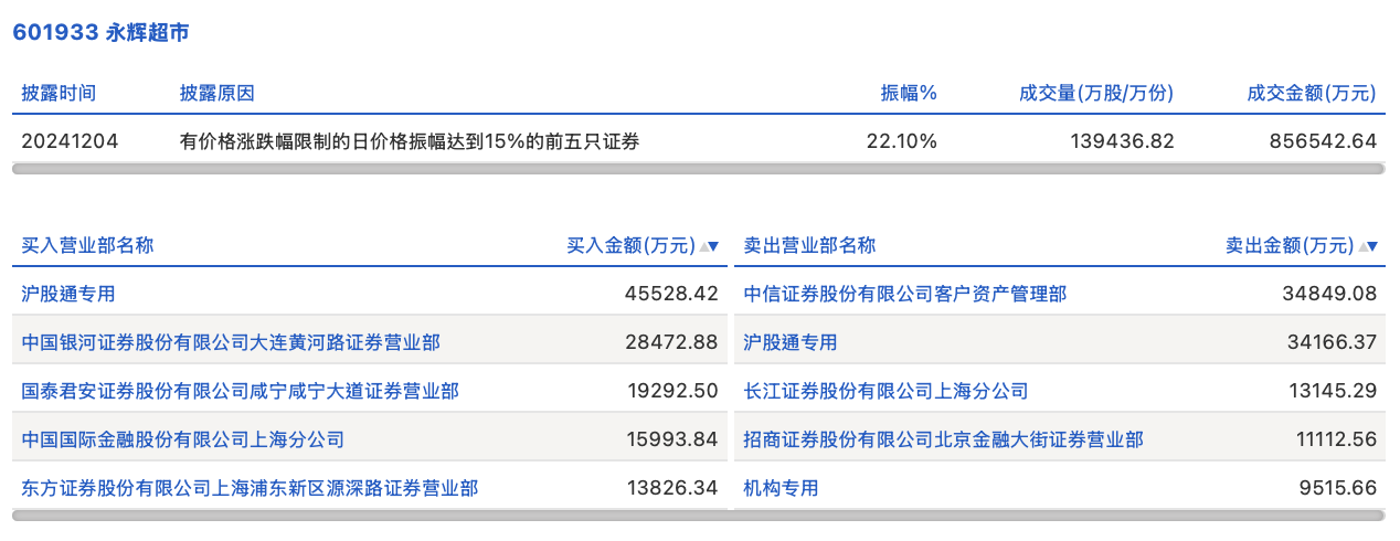 12月4日,永辉超市今日涨停,龙虎榜数据显示,上榜营业部席位全天成交22.59亿元,占当日总成交金额比例为26.37%。其中,买入金额为12.31亿元,卖出金额为10.28亿元,合计净买入2.03亿元。