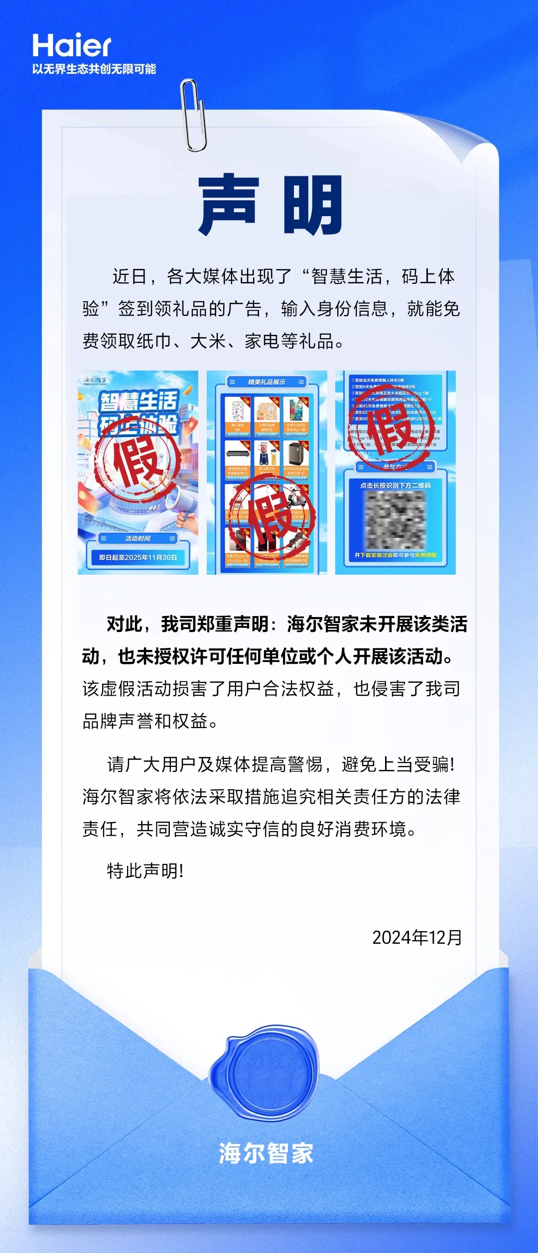 12月4日,海尔智家发布声明:近日各大媒体出现“智慧生活,码上体验”签到领取礼品的广告,称输入身份信息就能免费领取纸巾、大米、家电等礼品。对此,海尔智家声明,未开展该类活动,也未授权许可任何单位或个人开展该活动。海尔智家将依法采取措施追究相关责任方的法律责任。