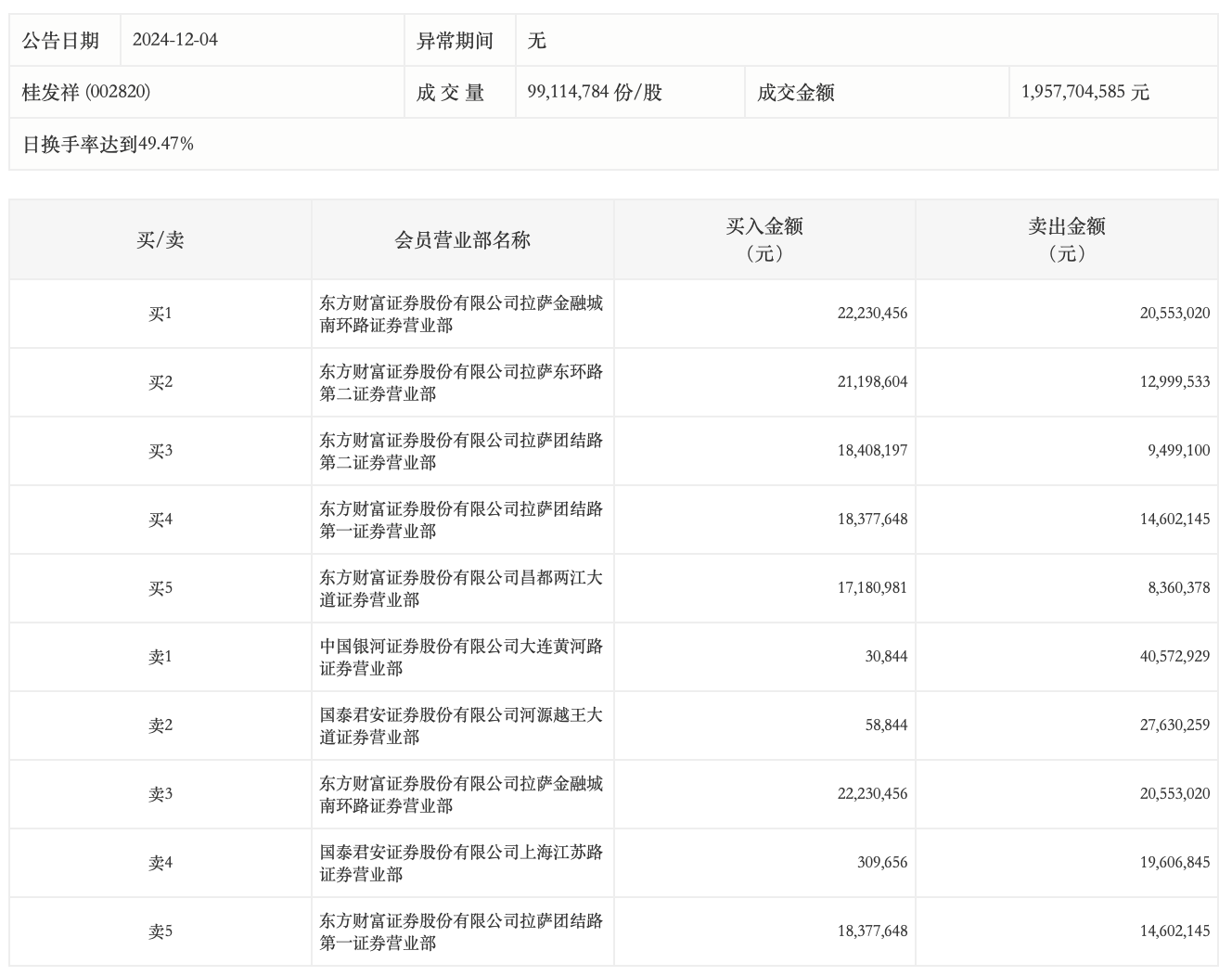 12月4日,桂发祥今日涨停,龙虎榜数据显示,上榜营业部席位全天成交2.52亿元,占当日总成交金额比例为12.85%。其中,买入金额为9779.52万元,卖出金额为1.54亿元,合计净卖出5602.9万元。