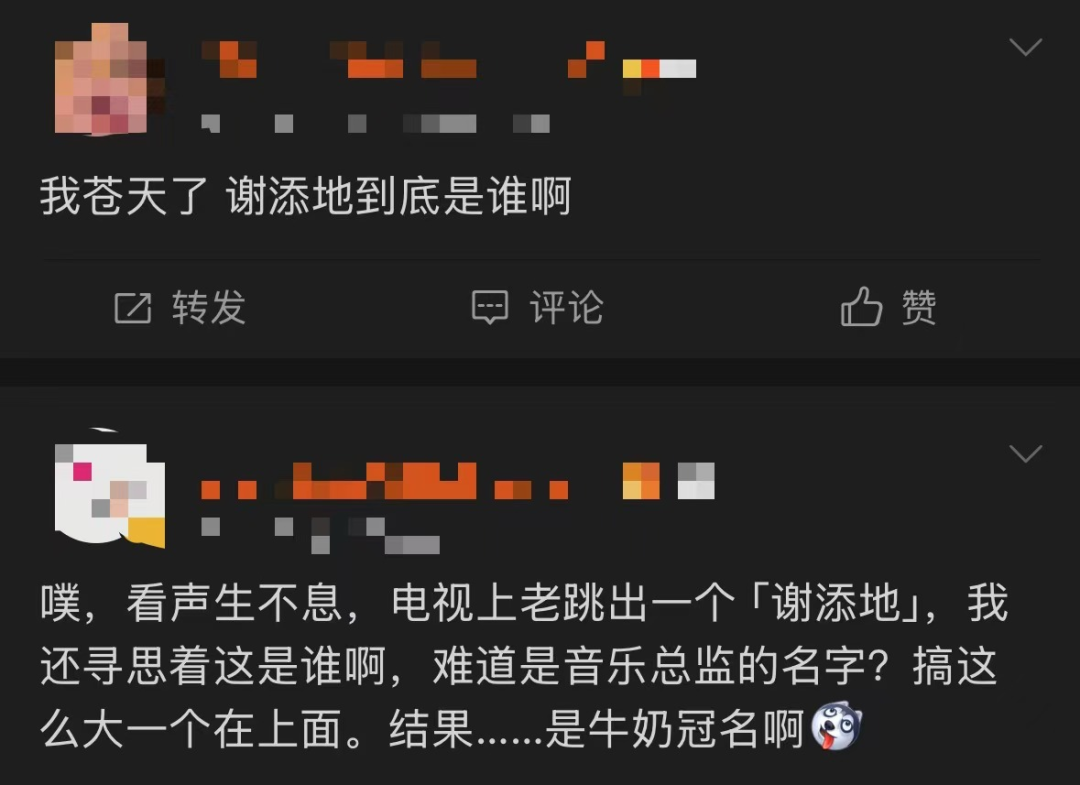 在节目中,无论是大屏幕的左侧、中间、右侧还是右下角,四个位置的“谢添地”字样都异常醒目,不少观众吐槽硕大的“谢添地”比歌手本人的尺寸还要大,每一个传播切片都能为“谢添地”带来了巨大的流量曝光,也让它被不少网友视作“今年最成功的冠名品牌”。