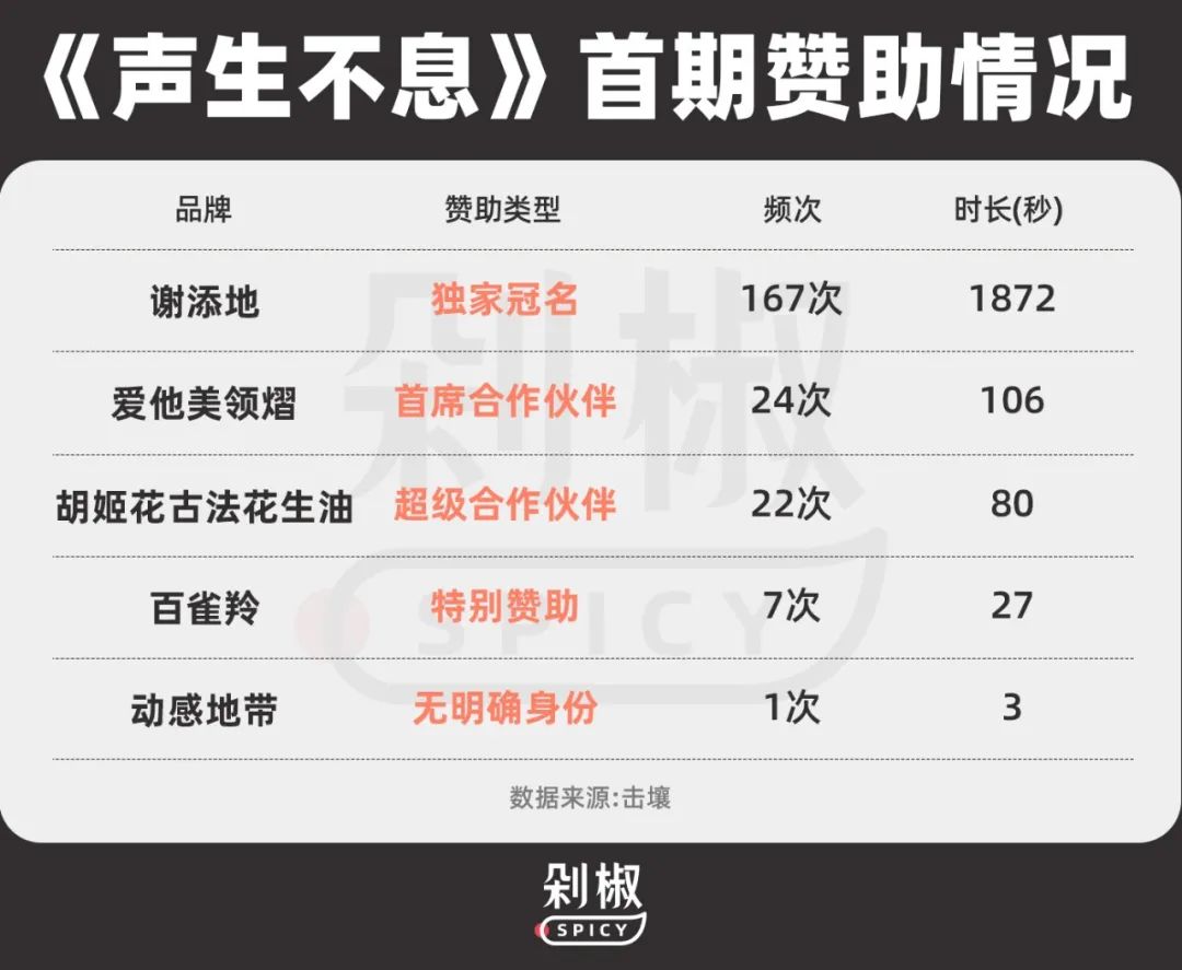 不少品牌早早入场并享受到了市场红利。据剁椒统计,节目开播便拿到了谢添地、爱他美、胡姬花、百雀羚和动感地带五家品牌的合作,其中总冠名赞助商为“谢添地”,也被网友评为最冷门的广告主。