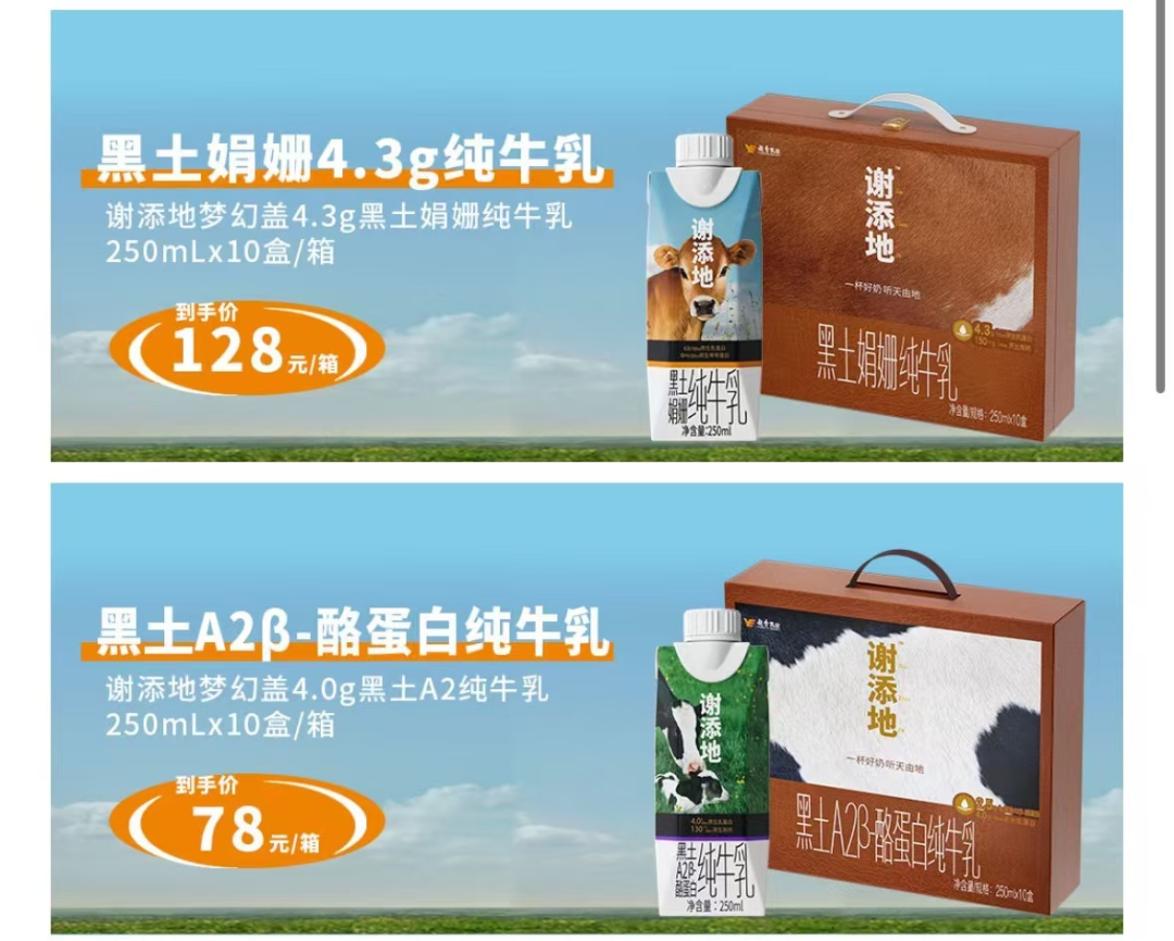 目前,“谢添地”推出了两款常温白奶产品:梦幻盖黑土娟姗纯牛奶,官方商城售价为128元/箱(250mlx10盒);梦幻盖黑土A2纯牛奶,售价为78元/箱(250mlx10盒),即每瓶价格分别为7.8元和12.8元。