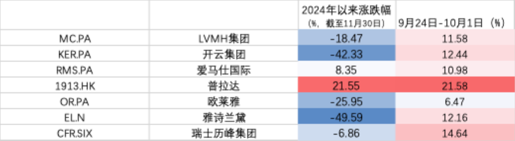 中国市场与奢侈品行业繁荣的紧密相关,亦折射在资本市场。「924」政策出台后一周内,中国市场的反弹预期刺激各大奢侈品集团股价明显上涨(见图表)。