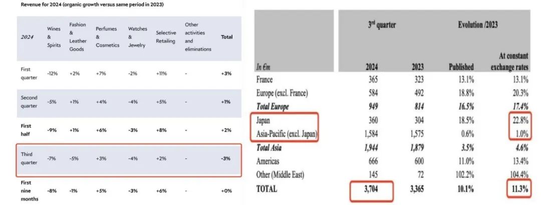 图表:LVMH集团、爱马仕集团2024年第三季度业绩表现