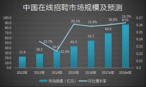 近年来创业热情高涨以及城镇化进程加快带来劳动力市场大规模增长的态势,为招聘市场创造出繁荣的景象。互联网的发展和择业规模的扩大促进互联网招聘市场的不断发展演进。中国在线招聘行业从2000年开始起步,2010年后正式进入高速发展期。2013年,中国在线招聘市场规模为28.2亿元人民币,与2012年相比增长23.7%。由于求职者数量体量已经非常庞大,因此增速逐步减缓,预计今年在线招聘市场规模为68.9亿元,2018年将达到87.0亿元人民币,求职者规模将突破1.6亿人。