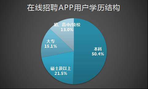 使用在线招聘APP本科以上的高学历用户占比71.9%,本科学历占比近半成。初、高中、技校以及大专用户占比28.2%,随着在线招聘职位的丰富,为这部分学历较低但具有一定擅长技能的人群提供更多的求职机会。