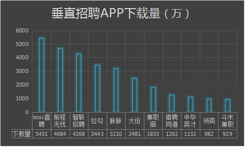 在垂直招聘APP应用中,boss直聘以5431万的下载量排在首位,这是一款能让企业老板和求职者直接在线上开展一对一沟通的应用,省去繁琐的招聘环节,其便捷性备受求职者追捧。排在后两位的分别为前程无忧和智联招聘,作为中国主流的综合招聘网站,拥有较高的品牌知名度,发展完善且模式成熟,并占据近六成的在线招聘市场份额。排在第四位的拉钩网是专门为互联网从业人群提供求职招聘的平台,专注于特定行业、人群,招聘效率更高。而脉脉则是以职场社交切入,依托社交圈子和职业人脉,帮助求职者更快的获得理想职位。