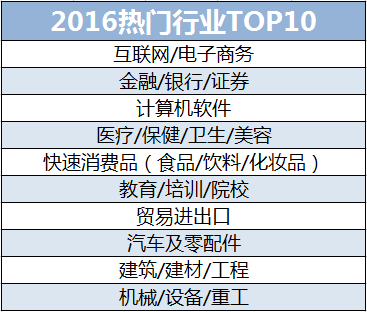 互联网浪潮下,互联网及电子商务领域无疑将成为2016年热门行业TOP1,庞大的求职需求也催生专门针对互联网从业人员招聘APP的出现。紧随其后的是金融、银行、证券行业;计算机软件排在第三位。医疗、保健等刚需行业以及快速消费品行业前景十分可观,因此纷纷进入热门行业TOP5。